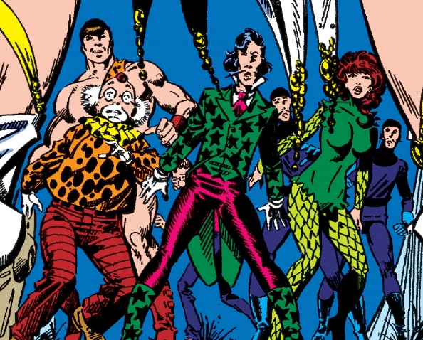 The original group included the Ringmaster, Blackwing, the Clown, Fire-Eater, the Great Gambinos, Human Cannonball, Live Wire, Rajah, Bruto the Strongman and Teena the Fat Lady.